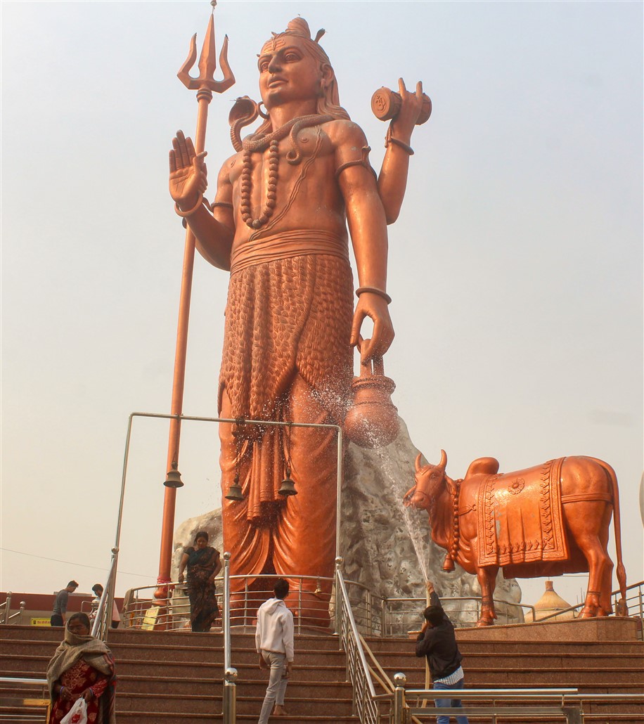 Hindu devotees gather in front of a 76ft statue of Lord Shiva in Jabalpur.