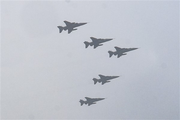 Indian Air Force aircrafts fly past the Central Hall of Parliament House.